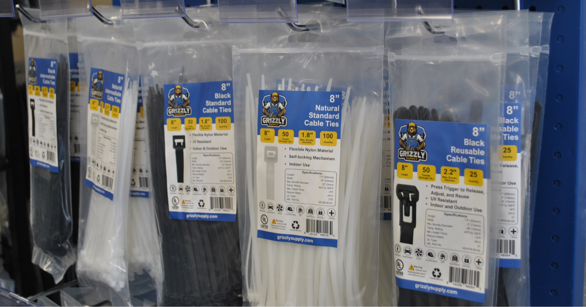 All ProductsGrizzly Supply offers every wire and cable management solution you need! Including cable ties, zip ties, reusable cable ties, heavy-duty cable ties, cable tie mounts, hook & loop cable straps, stainless steel cable ties, nylon cable ties, and more!