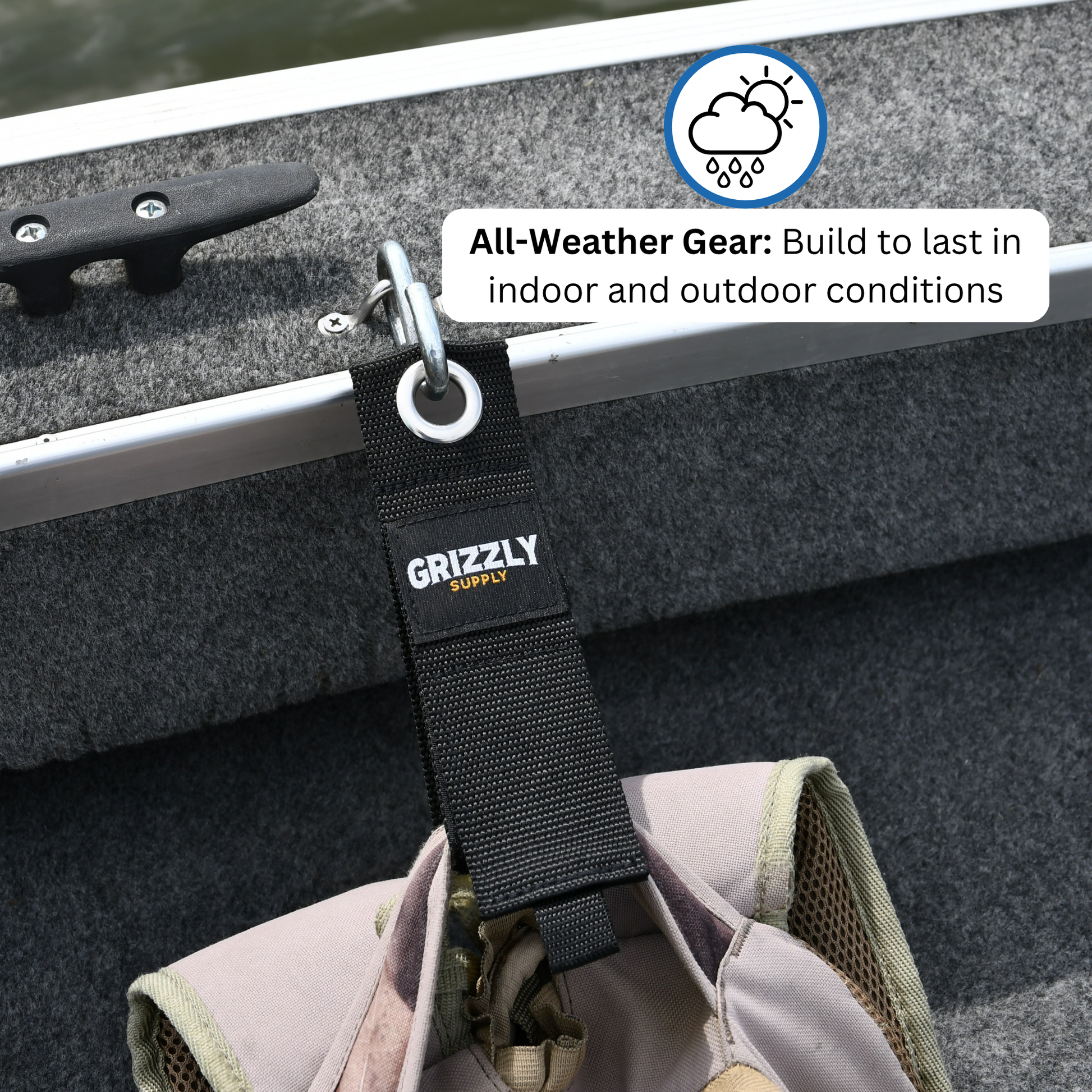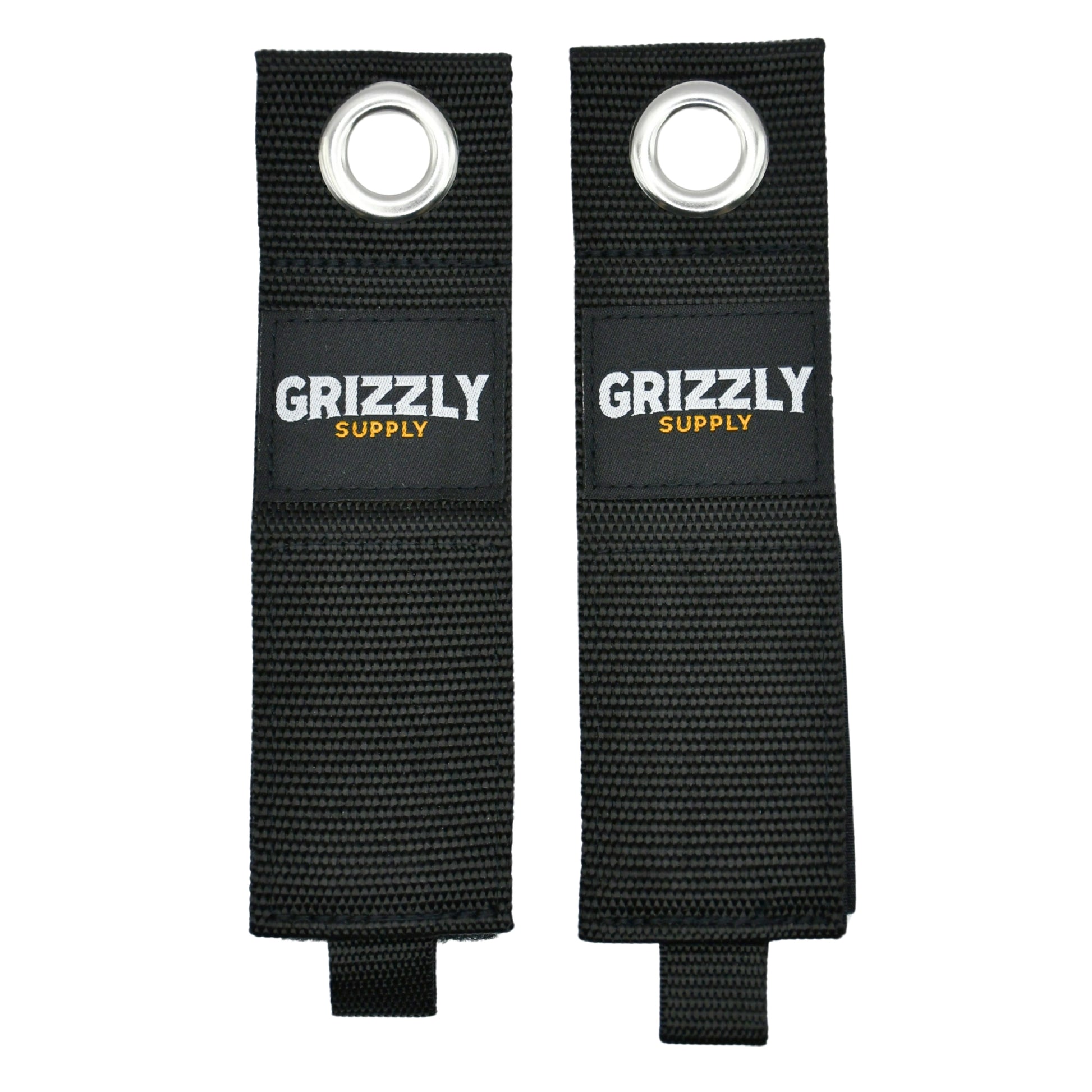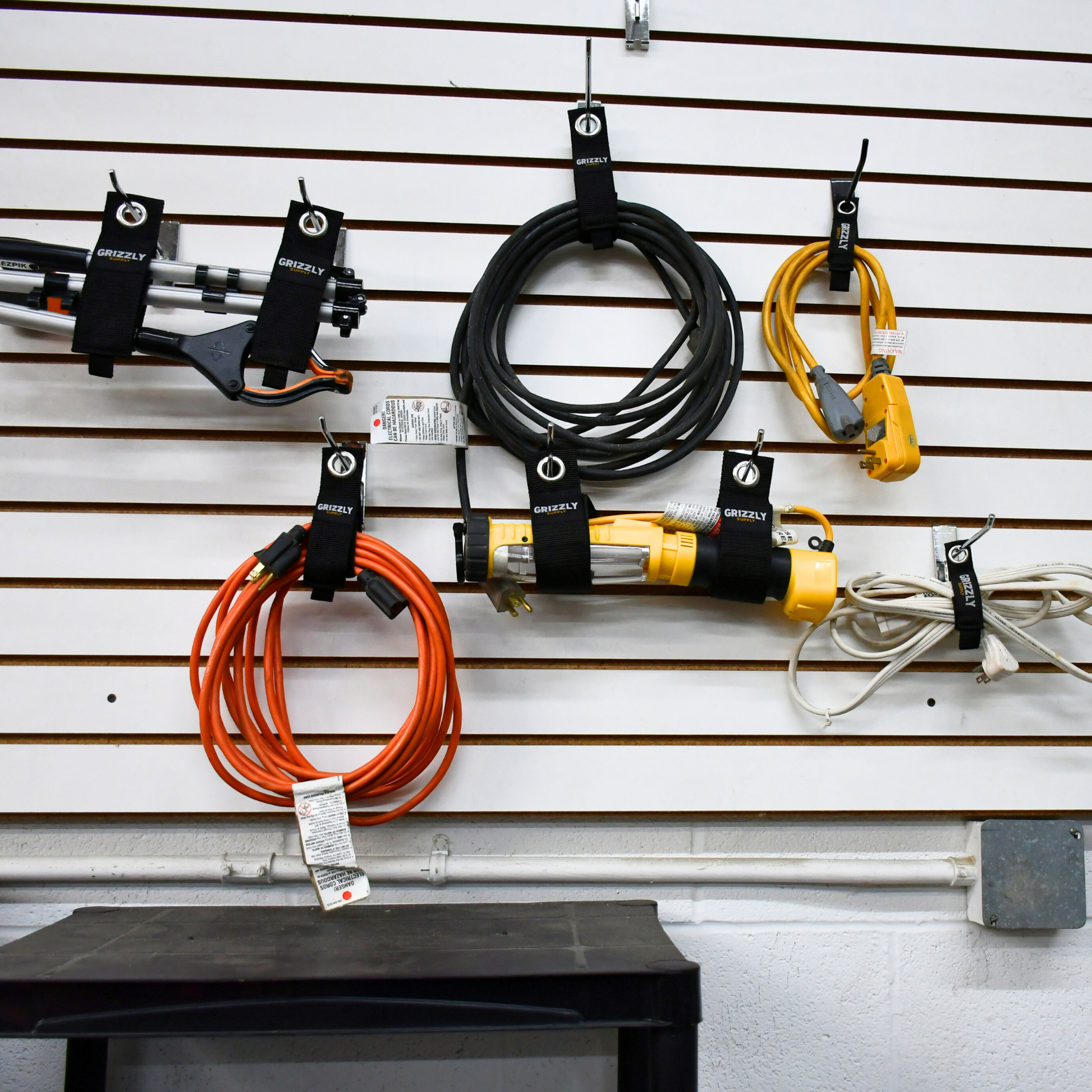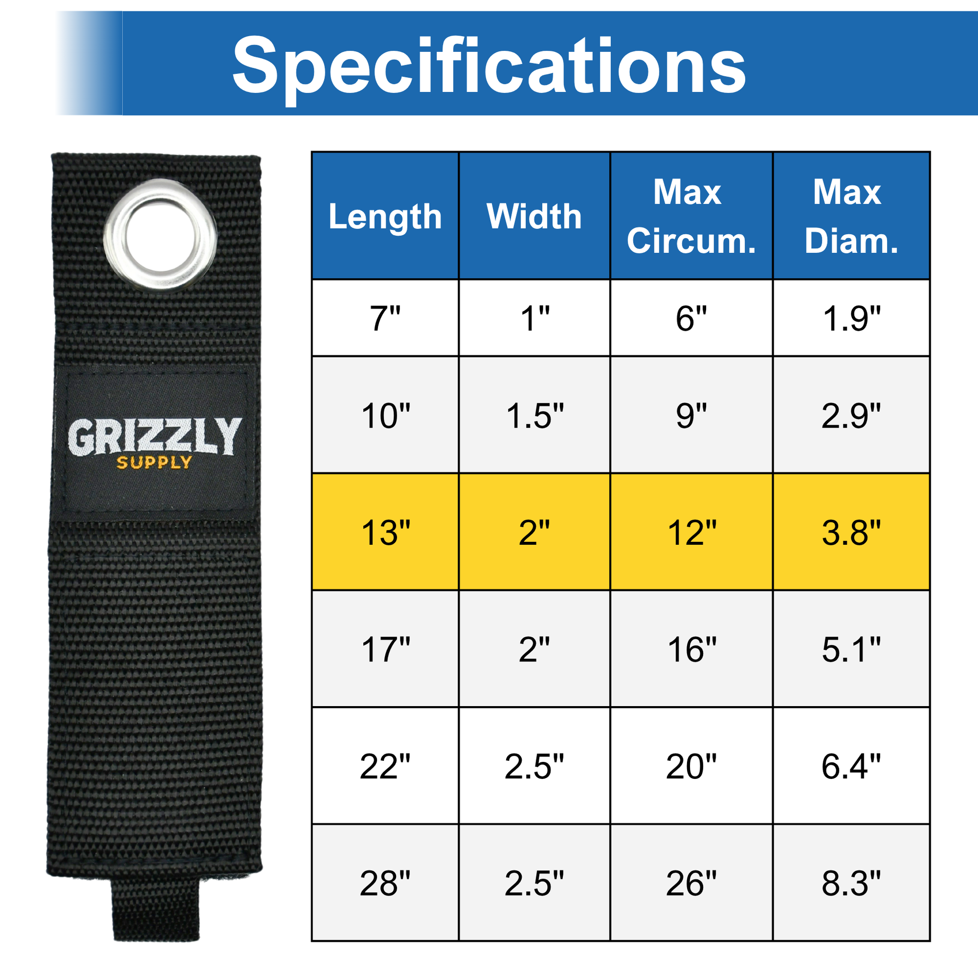 - Grizzly Supply's 13" Black Hook and Loop Storage Straps offer extra length for larger organizational tasks