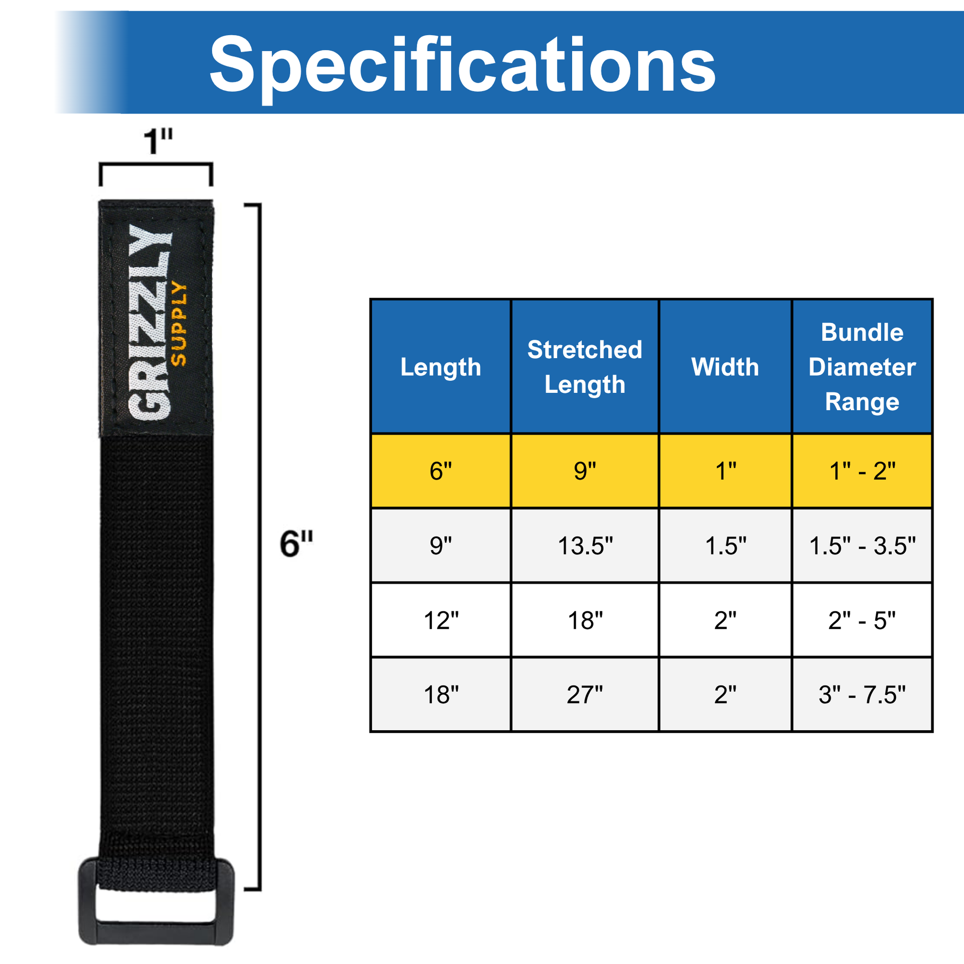 - Grizzly Supply's 6" Black Stretch Straps provide secure and flexible bundling for various tasks
